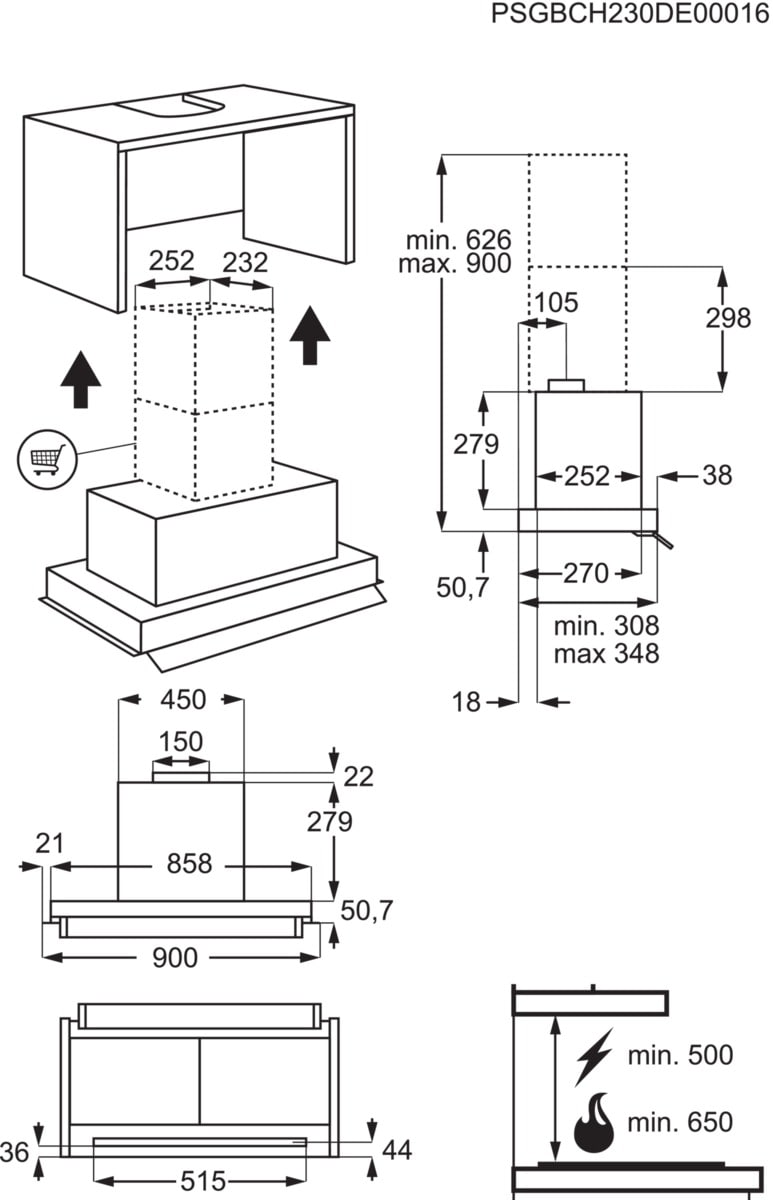 Typ odsavače: Výklopný, vestavba do skříňky, šířka 90 cm